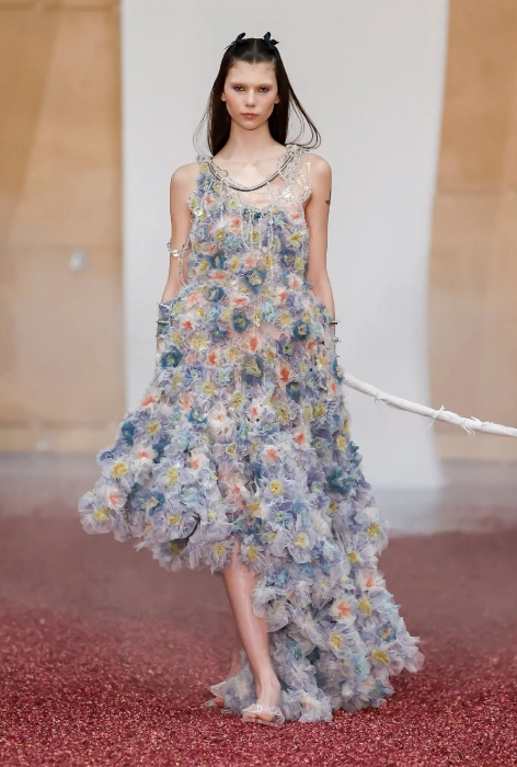 Y/Project presented a compelling case for upcycling, transforming denim scraps into something utterly breathtaking. What at first glance appeared to be intricate patterns of embroidery or delicate lacework on dresses was, in fact, the creative reuse of denim shreds. This approach not only champions sustainability but also pushes the boundaries of traditional fabric use, showcasing how innovation can find its roots in the most unexpected places.